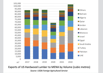 The total exports of US hardwood lumber and veneer to the Middle East and North Africa region surged by 11 per cent in 2022 to hit $107 million, said a report by American Hardwood Export Council (AHEC) released ahead of the Dubai WoodShow.