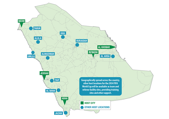 In addition to the 15 stadiums, Saudi Arabia is proposing 10 host locations that are scheduled to be the home of some of the training camps for participating teams before and during the tournament. These cities are known for their iconic tourist attractions, which will provide participating teams and fans an opportunity to explore the kingdom’s ancient, cultural heritage during the tournament.