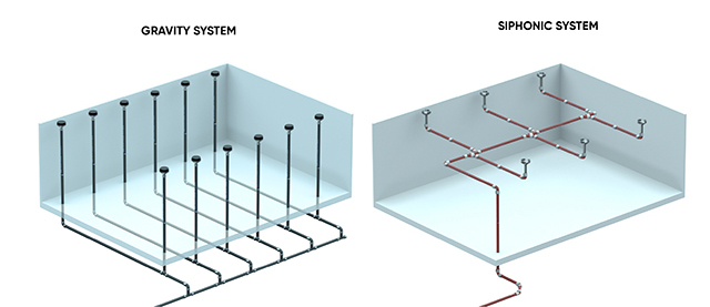 A comparison of the drainage network in a gravity system and a siphonic system.